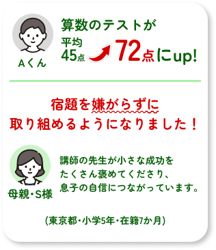 毎回の授業後に「学習した内容」「できたこと」「課題」「次回に向けたポイント」をまとめたレポートを保護者に共有。学習の進捗を把握しやすく、家庭でのフォローにも役立ちます。